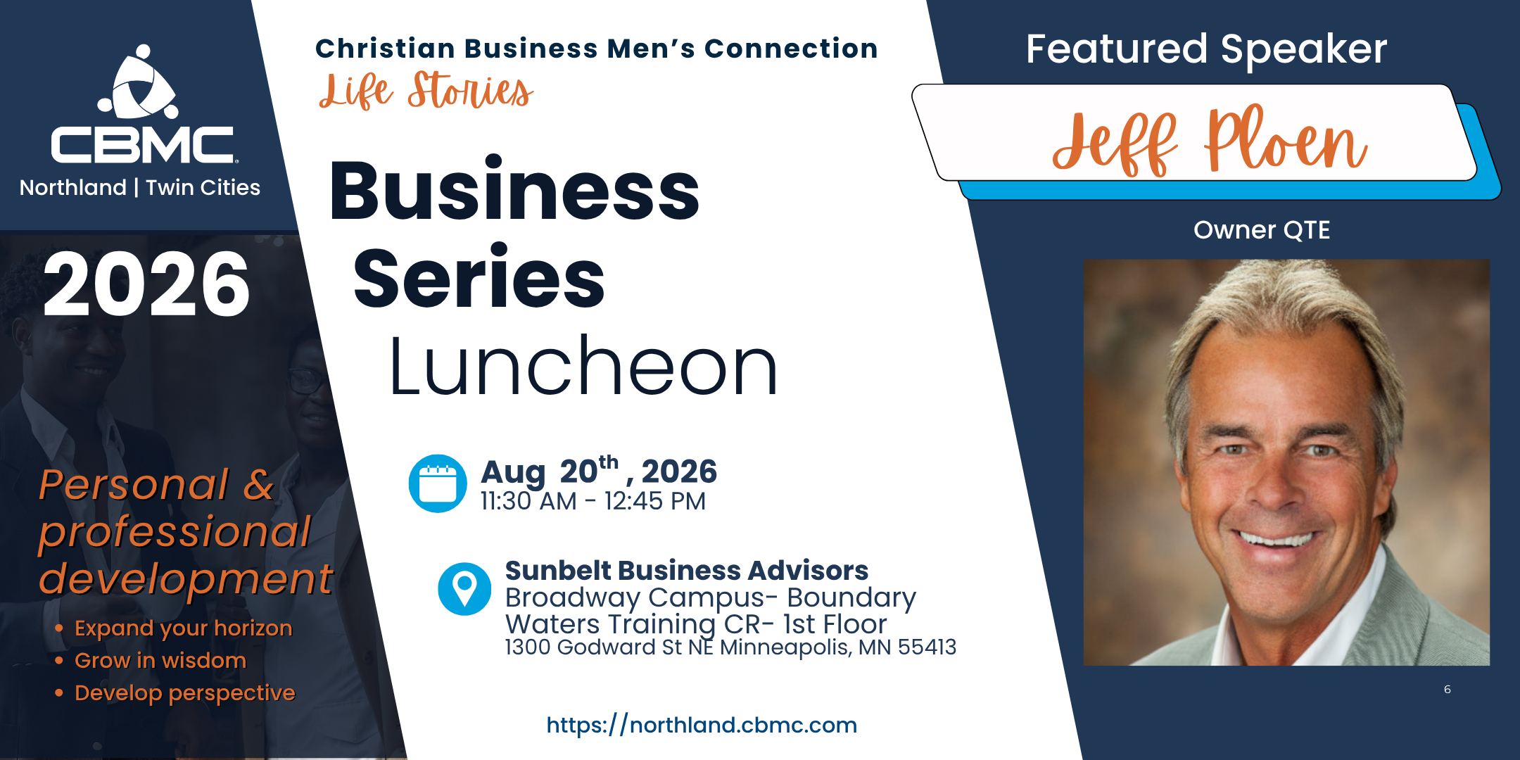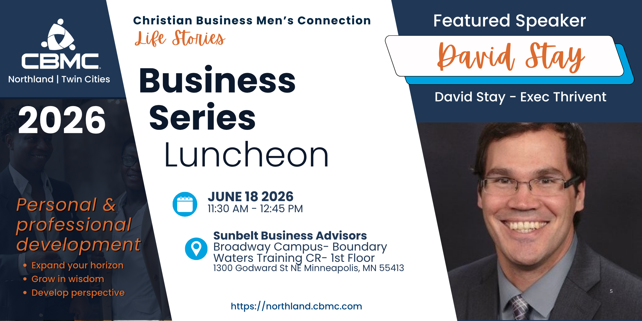 Twin Cities CBMC Business Series Luncheon June 18 @ 11:30 am – 1:00 pm Sunbelt Business Advisors 1300 Godward St. NE, Minneapolis, MN Please make plans to join us for the business luncheons of 2026, designed for business leaders!