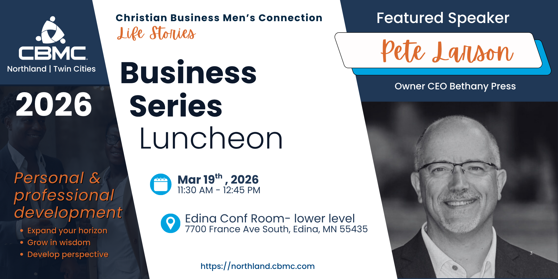 Twin Cities CBMC Business Series Luncheon March 19 @ 11:30 am – 1:00 pm Edina Conference Room 7700 France Ave S, Edina, MN, United States Please make plans to join us for the business luncheons of 2026, designed for business leaders!