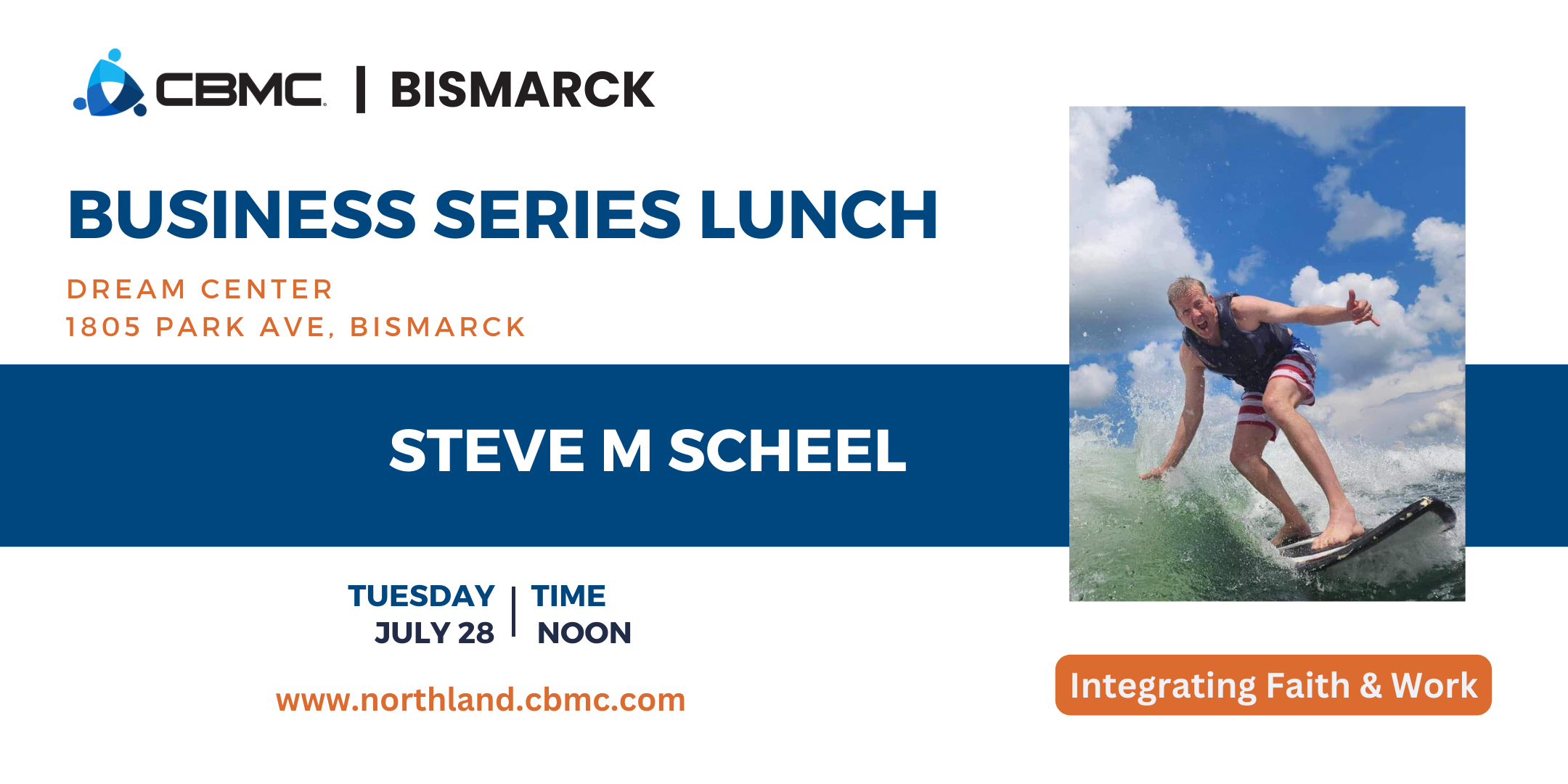 Bismarck CBMC Business Series Luncheon – Integrating Faith + Work July 28 @ 12:00 pm – 1:00 pm Dream Center Bismarck 1805 Park Avenue, Bismarck Businessmen & women are welcome! Lunch provided – Space is limited on a first come basis, Register today!