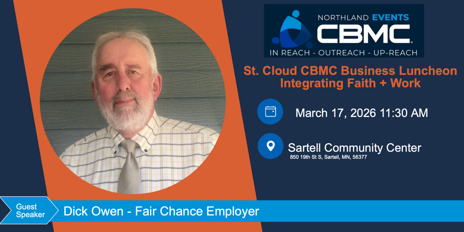 St. Cloud CBMC Business Luncheon – Integrating Faith + Work March 18 @ 11:30 am – 1:00 pm Sartell Community Center 850 19th St S, Sartell St. Cloud CBMC Business Luncheon – Integrating Faith + Work